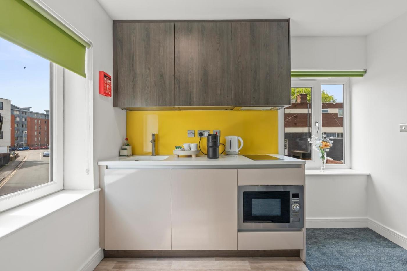 One-Bedroom Apartment. This apartment consists of 1 bedroom, kitchen and 1 bathroom with a shower. Guests can make meals in the kitchen that is equipped with a stovetop, a refrigerator, a microwave and a tea and coffee maker. The apartment provides a washing machine, a carpeted floor, heating, a TV, as well as city views. The unit offers 1 bed.