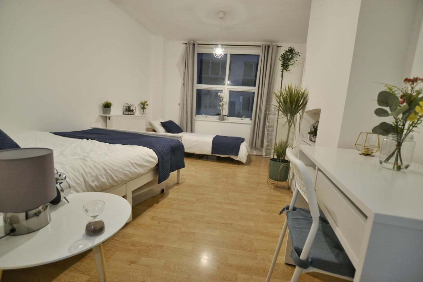 One-Bedroom Apartment. The apartment has 1 bedroom, 1 bathroom and a kitchen. The apartments kitchen is available for cooking and storing food. This apartment features a washing machine, heating and a flat-screen TV with streaming services. The unit has 2 beds and 1 futon.