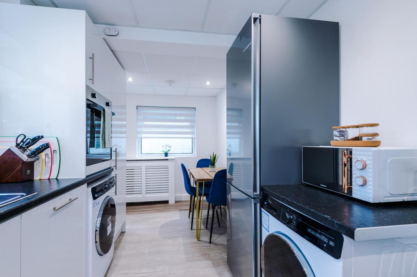 Four-Bedroom House. Featuring a private entrance, this holiday home also consists of 4 bedrooms, a seating area and 3 bathrooms with a shower and a hairdryer. Guests can make meals in the kitchen that is equipped with a refrigerator, a dishwasher, an oven and a microwave. The holiday home provides a washing machine, a tea and coffee maker, a dining area, a flat-screen TV with streaming services, as well as garden views. The unit offers 4 beds.