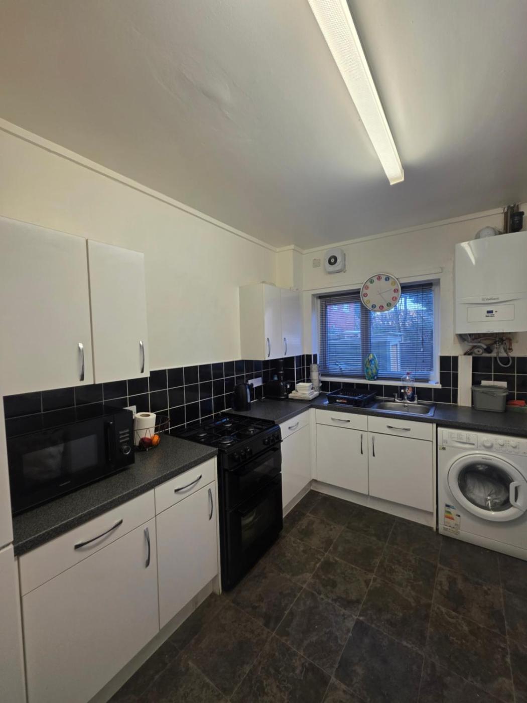 Double Room. The double room features a washing machine, a dining area, as well as a shared bathroom boasting a bath and a shower. The well-fitted kitchen has a refrigerator, kitchenware, a microwave and an electric kettle. This double room offers heating, a flat-screen TV and a quiet street view. The unit has 1 bed.