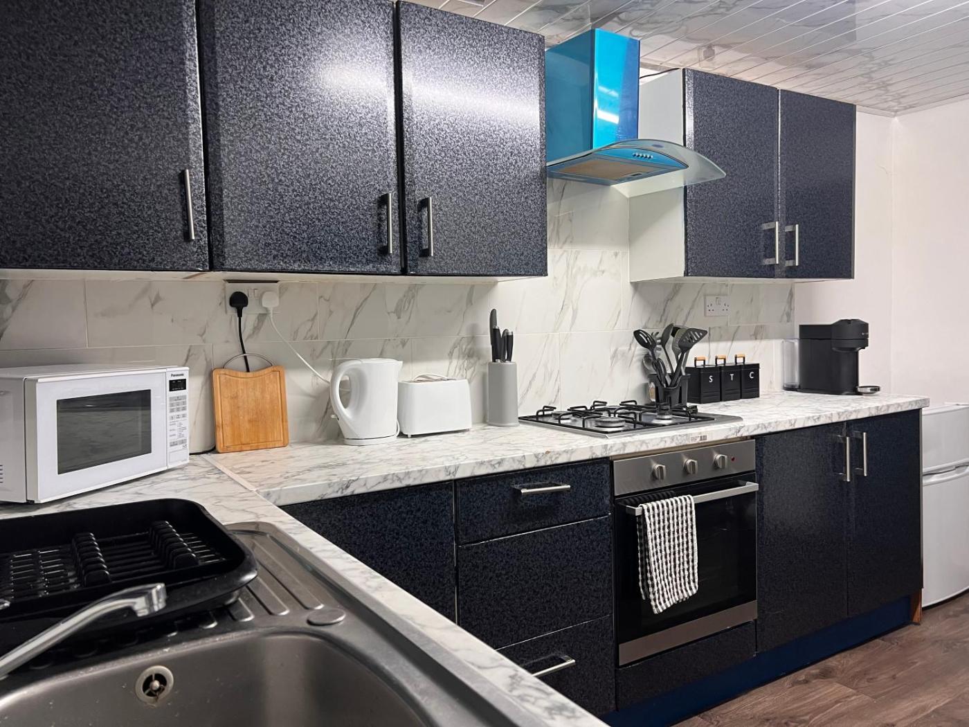 Three-Bedroom House. This spacious holiday home includes 1 living room, 3 separate bedrooms and 2 bathrooms with a bath and free toiletries. In the fully equipped kitchen, guests will find a refrigerator, kitchenware, an oven and a microwave. The holiday home offers a washing machine, a tea and coffee maker, a seating area, a flat-screen TV with streaming services, as well as garden views. The unit has 5 beds.