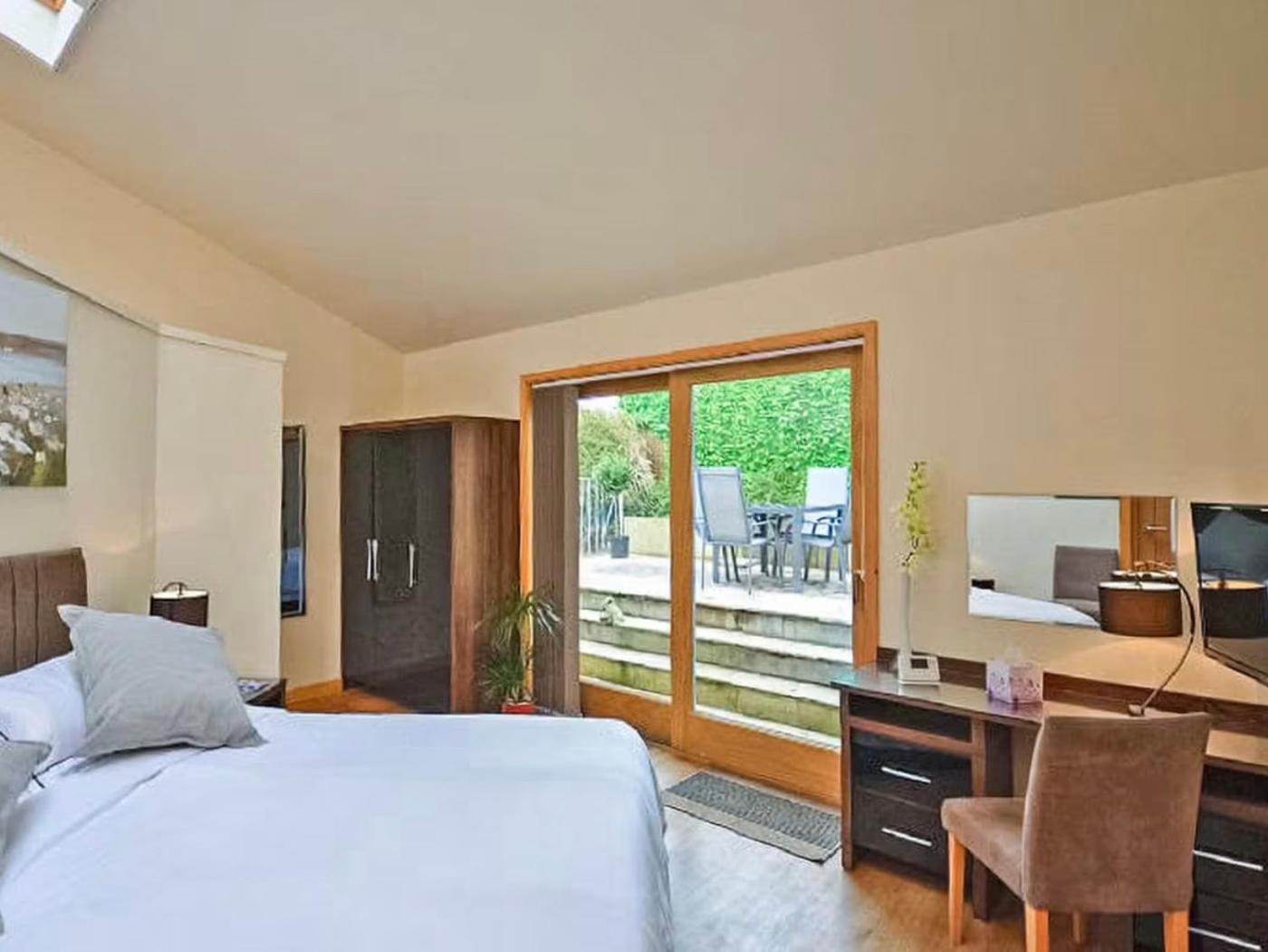Apartment - Annex. This apartment has a double bedroom and a lounge. There is a fitted kitchen and a dining area. It features a flat-screen TV. The bathroom has a walk-in shower.