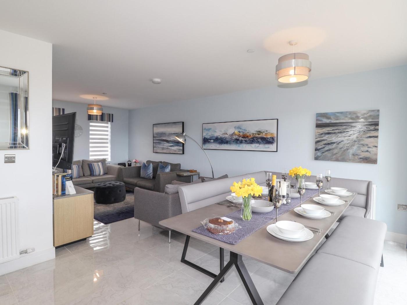 Holiday Home. This spacious holiday home comprises a kitchen, a seating area, 4 separate bedrooms and 3 bathrooms with a walk-in shower and a hairdryer. Meals can be prepared in the kitchen, which comes with a stovetop, a refrigerator, a dishwasher and an oven. The holiday home provides a TV, a washing machine, a coffee machine, a dining area as well as sea views. The unit offers 5 beds.